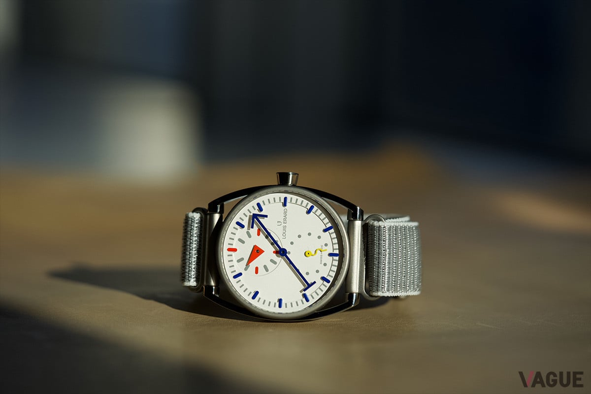 これはとくに愛好者の多い日本市場の要望を取り入れたもので、さわやかなダイヤルにアラン・シルベスタイン独特の赤・青・黄の三原色がよく映える。